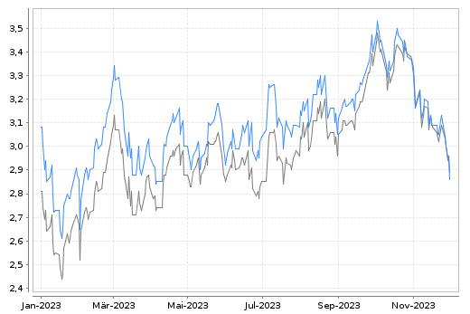 Zins-SWAP-Sätze der Zentralbank- blau 10 Jahre und grau 20 Jahre Zinsbindung seit dem 1.1.2022.